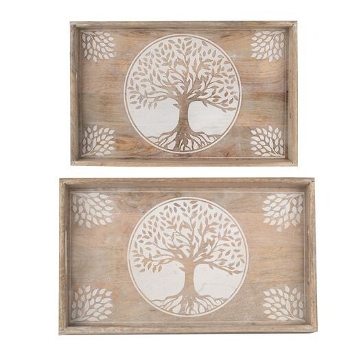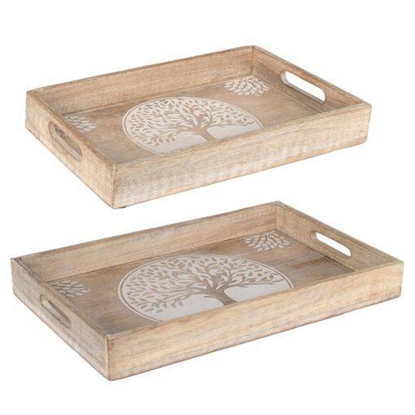 Bandejas Árbol Vida Pack 2 Unidades Decoracion. bandeja alargada hecha de madera de mango de alta calidad Puedes utilizar esta bandeja para presentar tus aperitivos preferidos: queso, embutidos o frutos secos Esta bandeja también puede ser utilizada como elemento decorativo en cualquier rincón de tu hogar: para dejar las llaves, bolígrafos, joyas o maquillaje.