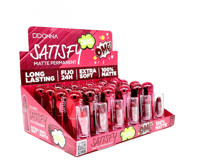 Satisfy es un lápiz labial satinado y mate en tonos universales púrpura, rosa y rojos para que encuentres el tono perfecto para la tonalidad de tu piel.